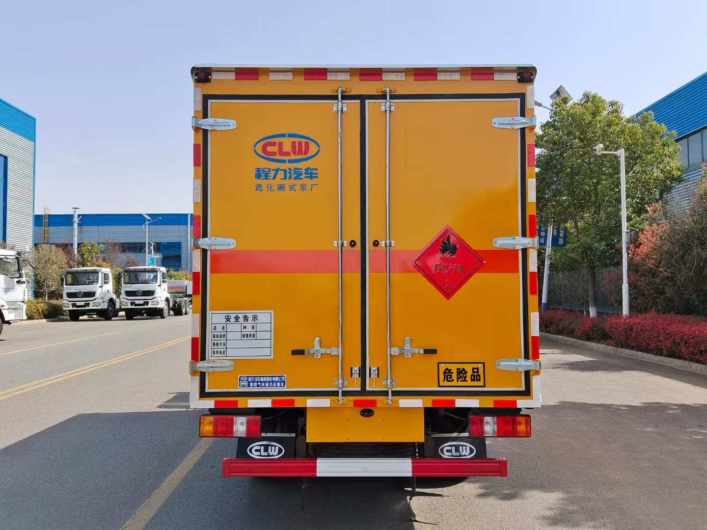 | 货箱配置 | 厢体为双层金属骨架结构,外板采用冷轧钢板,中间填充阻燃泡沫,内饰为铝板。底板为平板上铺防静电胶皮。厢内两侧加装固定货物卧环,门框带防盗报警器,顶部带烟雾报警器,厢体右侧选装侧门,随车配2个灭火器,危险标志牌,防火帽,危险品三角顶灯。 (选装瓦楞板货箱) (尾部可选装液压升降尾板) | ||