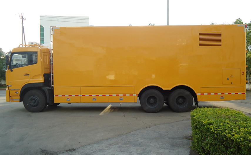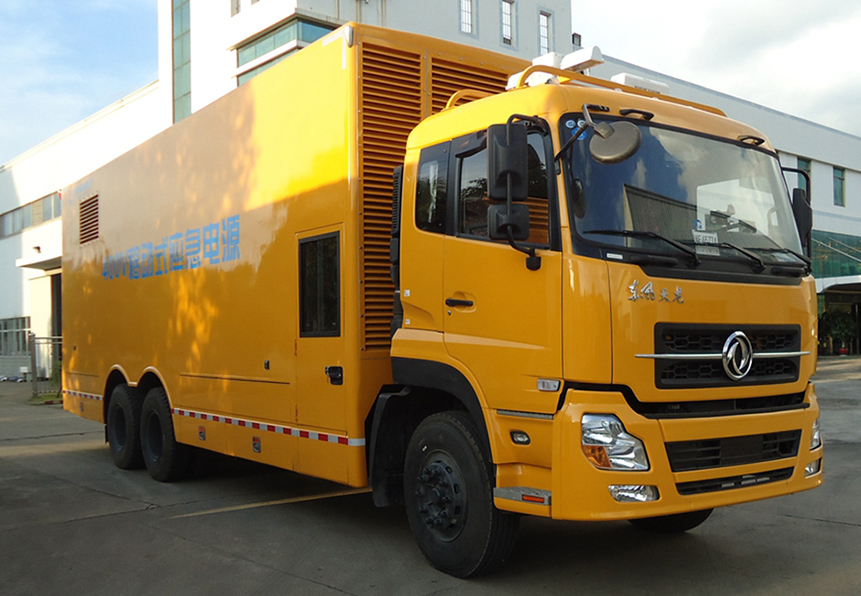 电缆线200米(YCI*95mm²)。发电机组的功率有20 kW至2000 kW,满足不同场景的用电需求。外观专利技术,耐用美观。车辆工作噪声可控制在75分贝以下。对于其本身来说噪音均是不可消除的,机组裸机噪声约103-105dB(A),唯一的办法是将其噪声进行隔断、衰减,以达到在厢体外噪声能符合相应的要求。侧门和后门设计为消声门,用橡胶条密封,形成声门效果,并阻止机组的噪声通过门洞传到室外。可折叠式升降照明灯,安装在车厢或驾驶室顶部,用于作业照明,可选择配置带遥控控制云台。