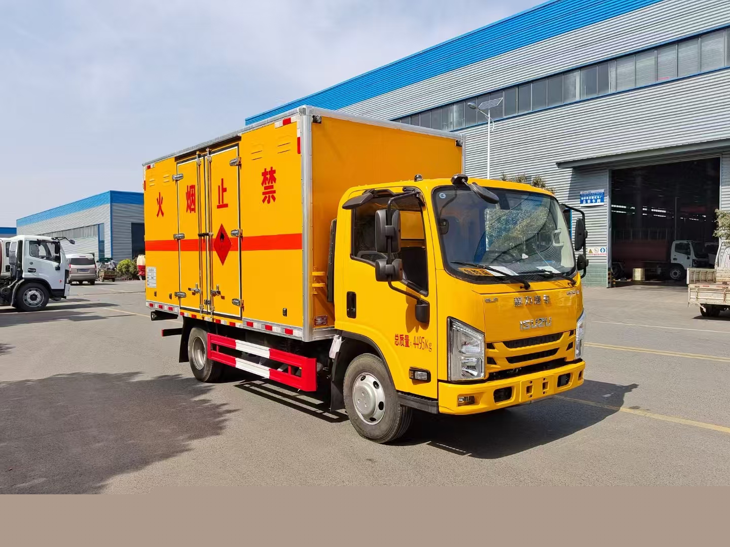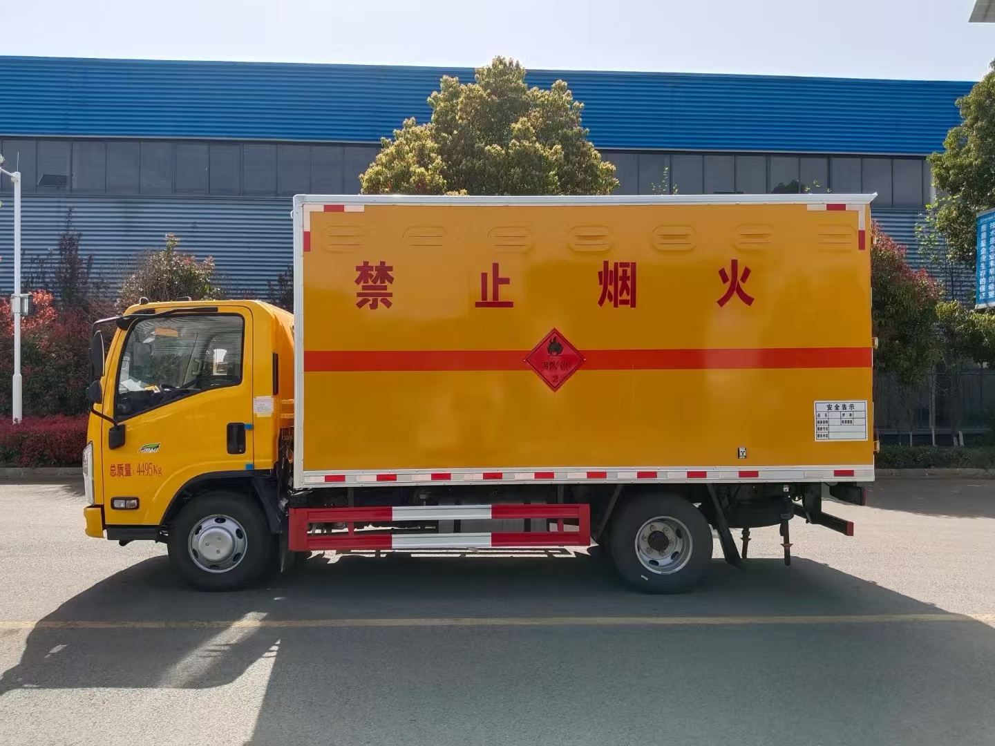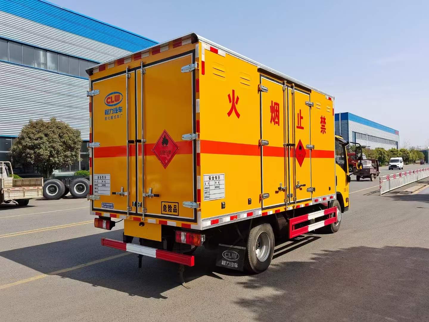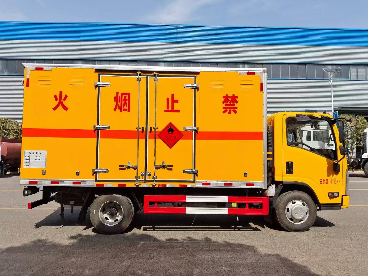 | 货箱配置 | 厢体为双层金属骨架结构,外板采用冷轧钢板,中间填充阻燃泡沫,内饰为铝板。底板为平板上铺防静电胶皮。厢内两侧加装固定货物卧环,门框带防盗报警器,顶部带烟雾报警器,厢体右侧选装侧门,随车配2个灭火器,危险标志牌,防火帽,危险品三角顶灯。 (选装瓦楞板货箱) (尾部可选装液压升降尾板) | ||